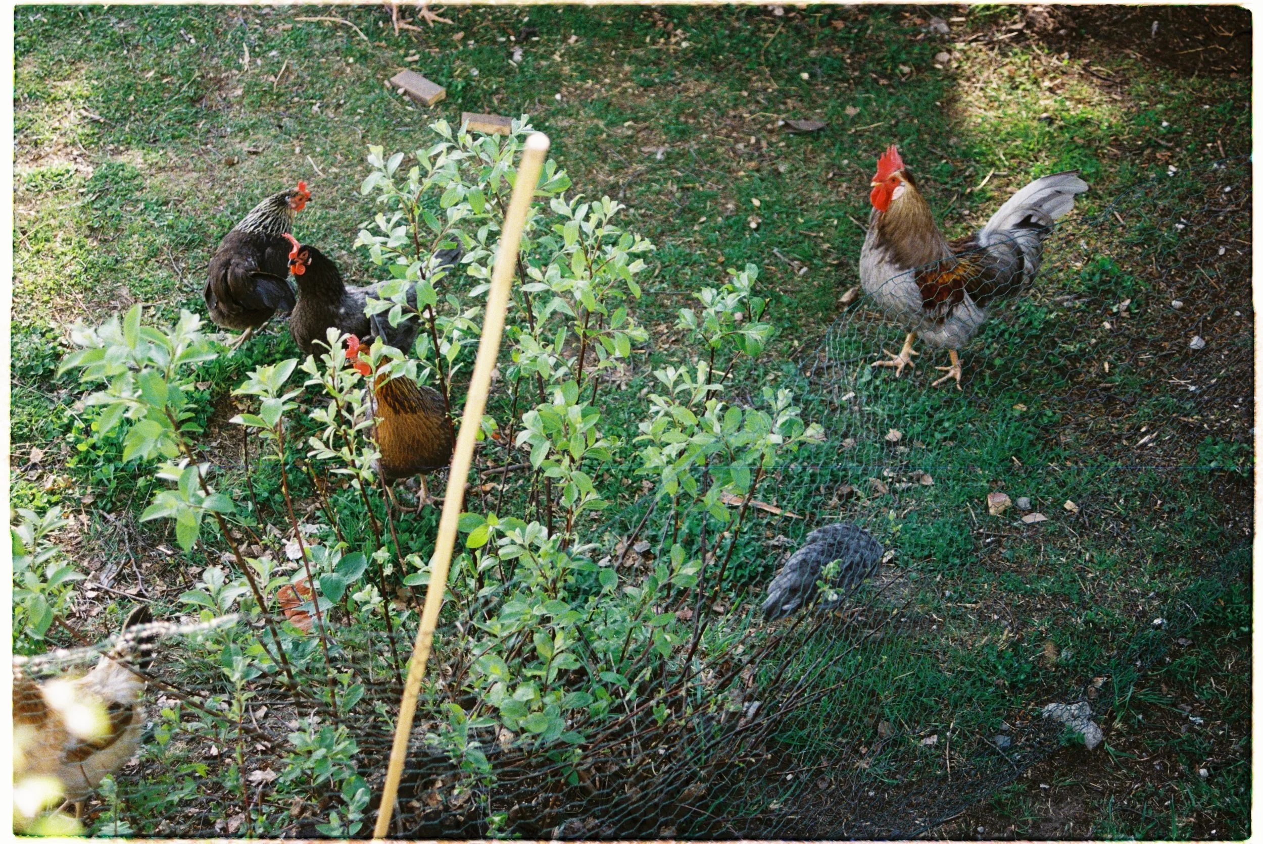Vi har en hel skokk med islandshøns som legger egg over hele gården- kyllinger som finner sin plass i flokken- og tre katter som vokter gården for mus og andre småkryp.